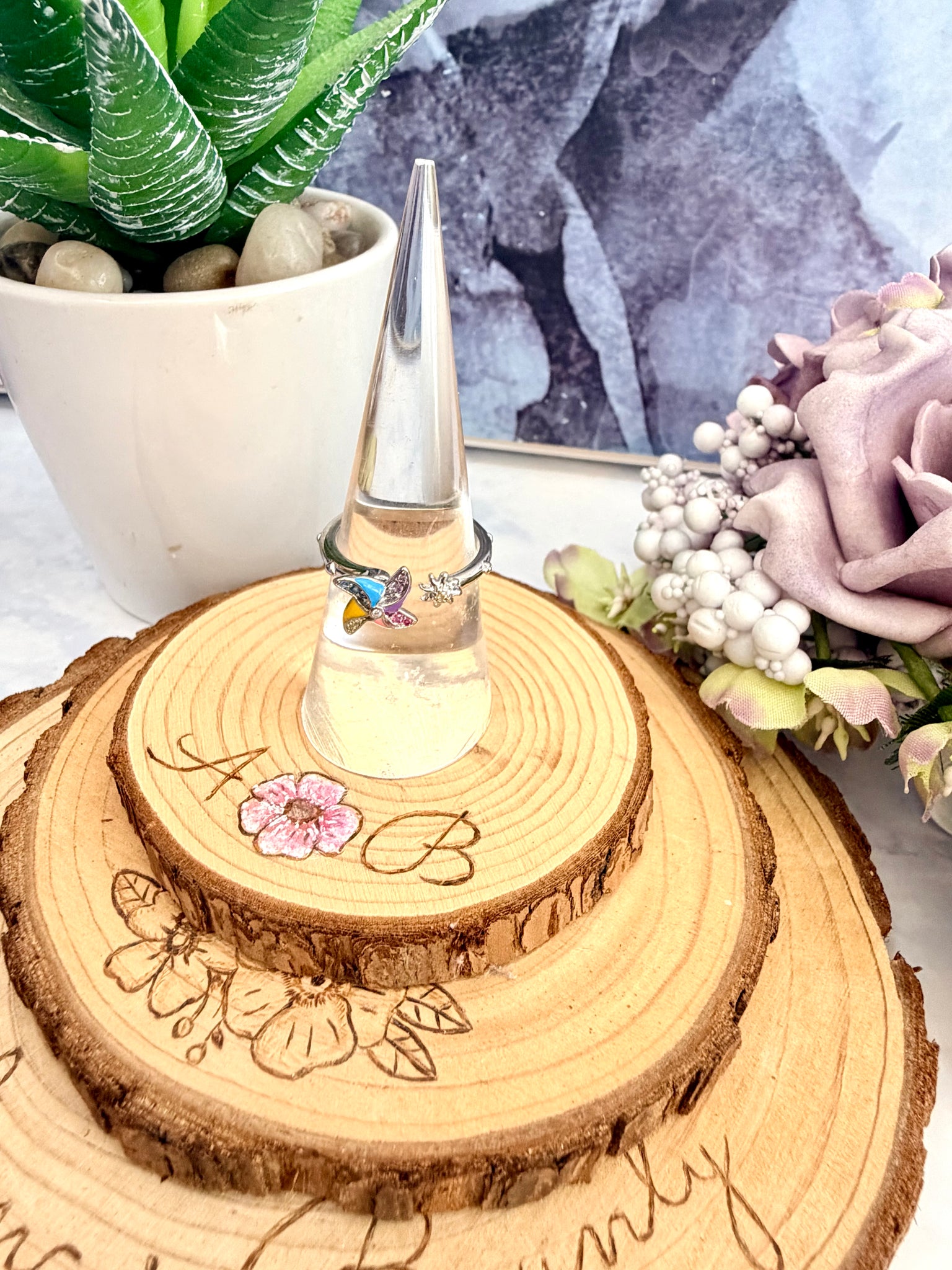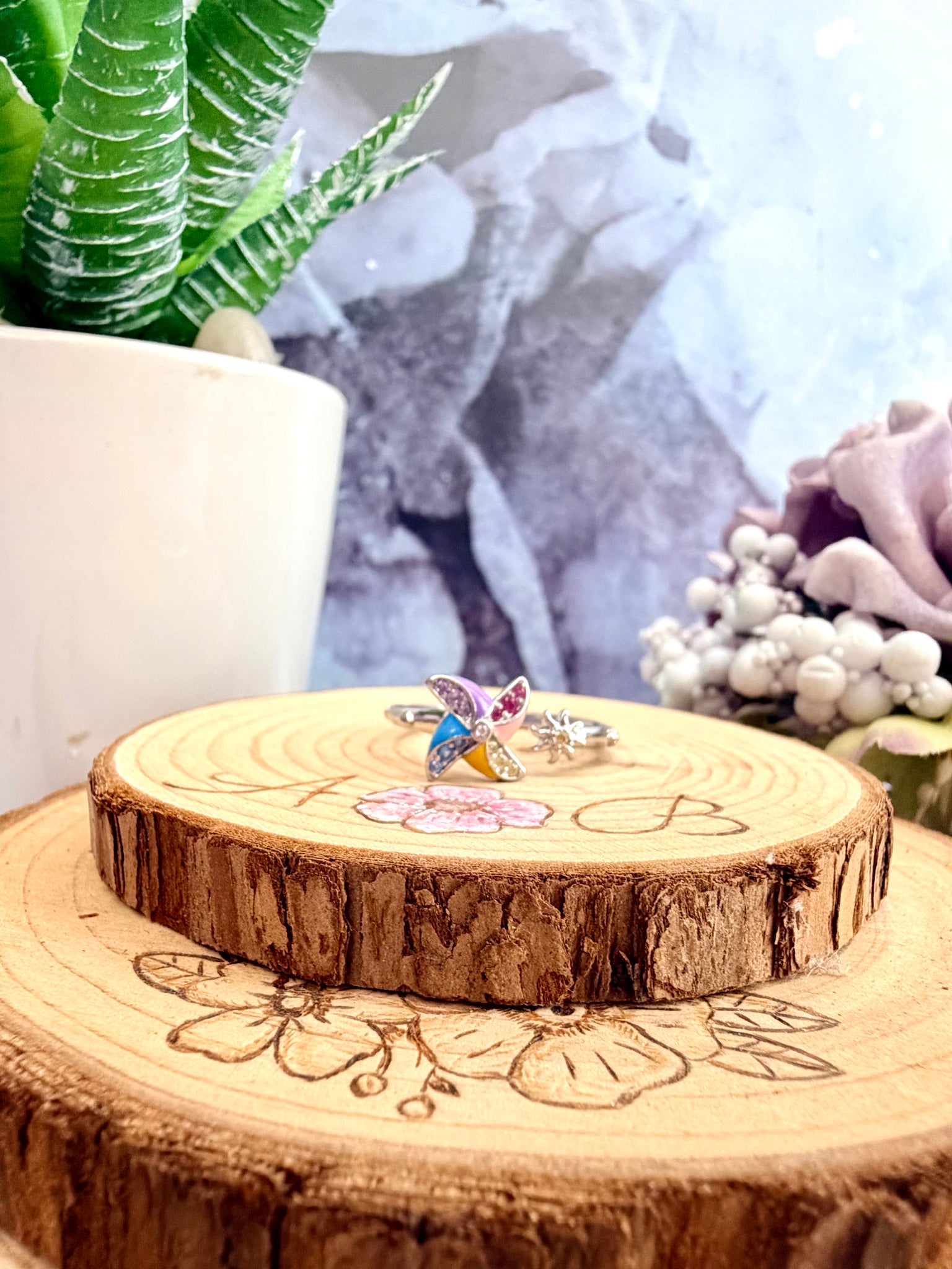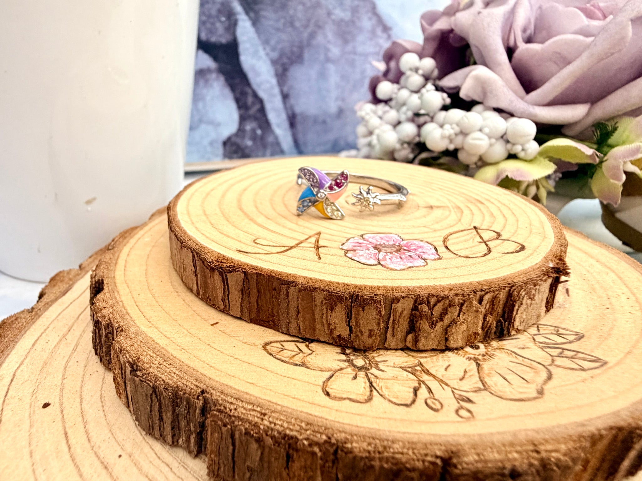 Meet Willa, a whimsical enamelled fidget spinner ring inspired by a classic child’s windmill. Vibrant, colourful blades spin smoothly, while sparkling stones add a little extra magic. The adjustable band ensures a comfortable fit for most finger sizes.